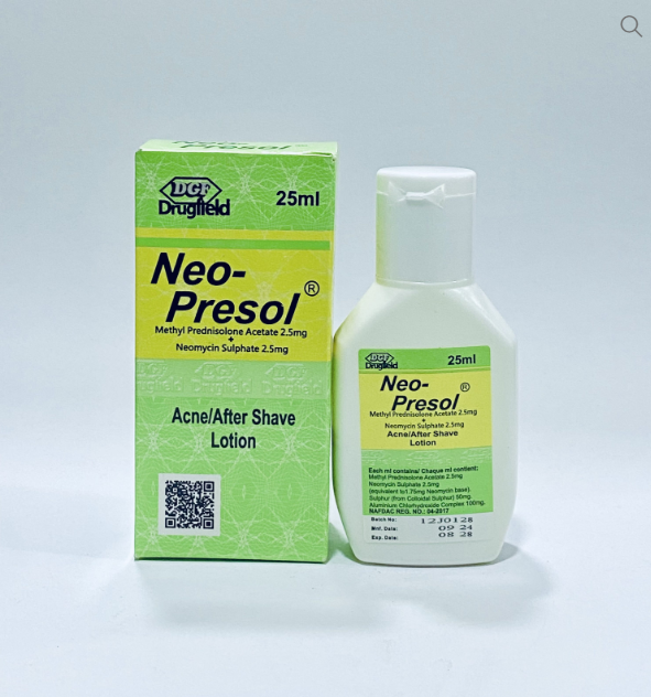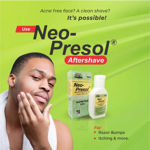 Neo Presol Acne/After-Shave Lotion clears bumps, fights acne, controls oil, calms irritation, and fades dark spots gradually.