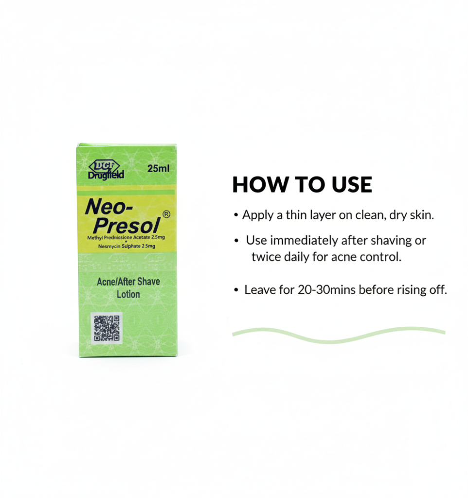 Neo Presol Acne/After Shave Lotion is a specialized triple-action topical solution formulated to treat various skin conditions including acne vulgaris, acne rosacea, and dermatitis. This versatile lotion also functions as an after-shave treatment, soothing irritation and preventing razor bumps.